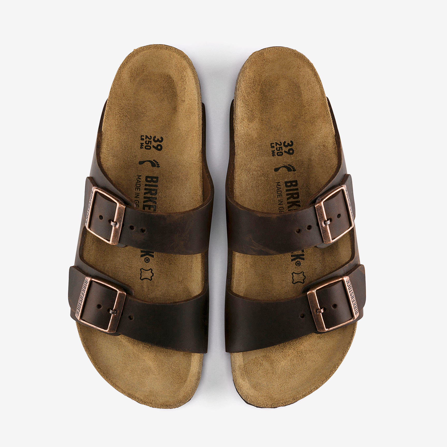 Die Birkenstock Arizona Sandalen in Oiled Habana bieten klassischen Stil mit geöltem Nubukleder und anatomisch geformtem Fußbett.